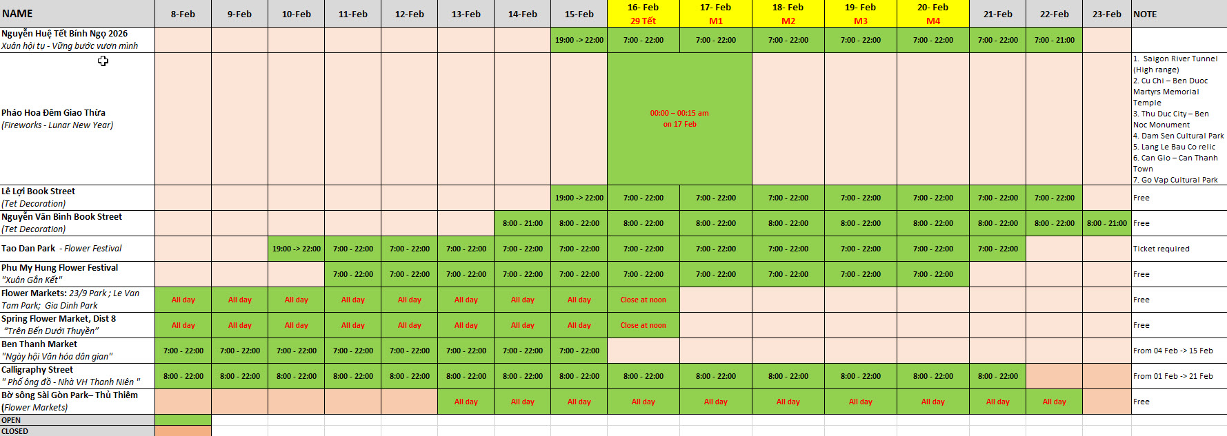 We are delighted to share an overview of key festivities and notable business closures in Ho Chi Minh City during Lunar New Year 2026. This vibrant holiday season brings the city to life with rich cultural traditions, celebratory events, and a uniquely festive atmosphere. Please stay tuned for essential updates designed to help you plan your activities smoothly and make the most of this special time of year.